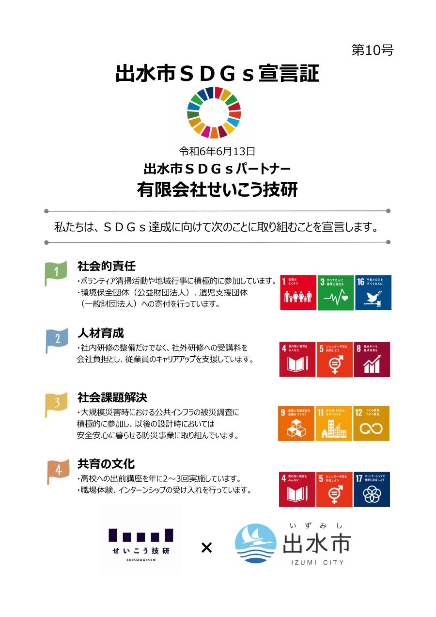 この度、せいこう技研は出水市SDGsパートナーとして宣言しました。